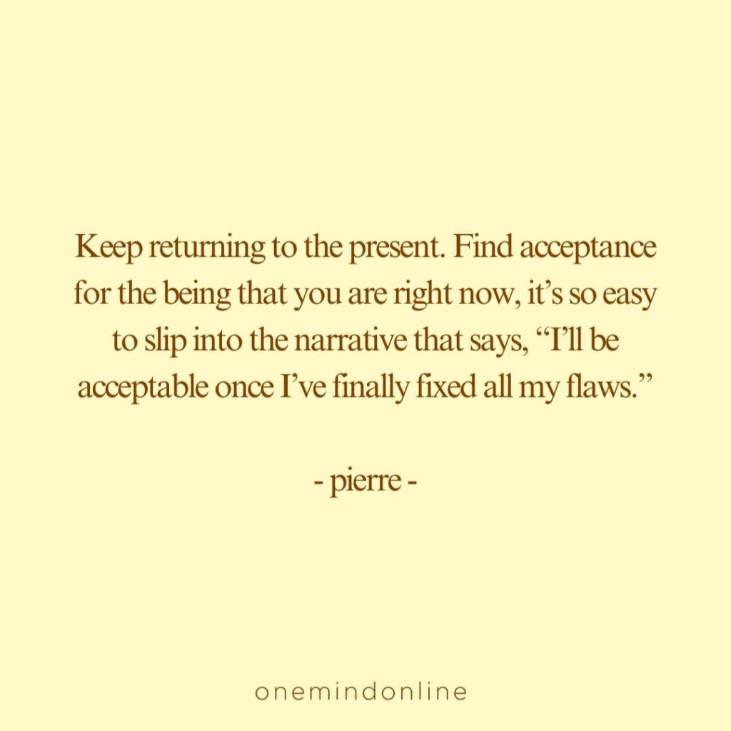 Keep returning to the present. Find acceptance for the being that you are right now, it’s so easy to slip into the narrative that says, “I’ll be acceptable once I’ve finally fixed all my flaws.” – pierre –