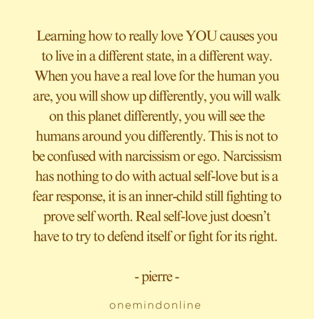 Learning how to really love YOU causes you to live in a different state, in a different way. When you have a real love for the human you are, you will show up differently, you will walk on this planet differently, you will see the humans around you differently. This is not to be confused with narcissism or ego. Narcissism has nothing to do with actual self-love but is a fear response, it is an inner-child still fighting to prove self worth. Real self-love just doesn’t have to try to defend itself or fight for its right. – pierre –