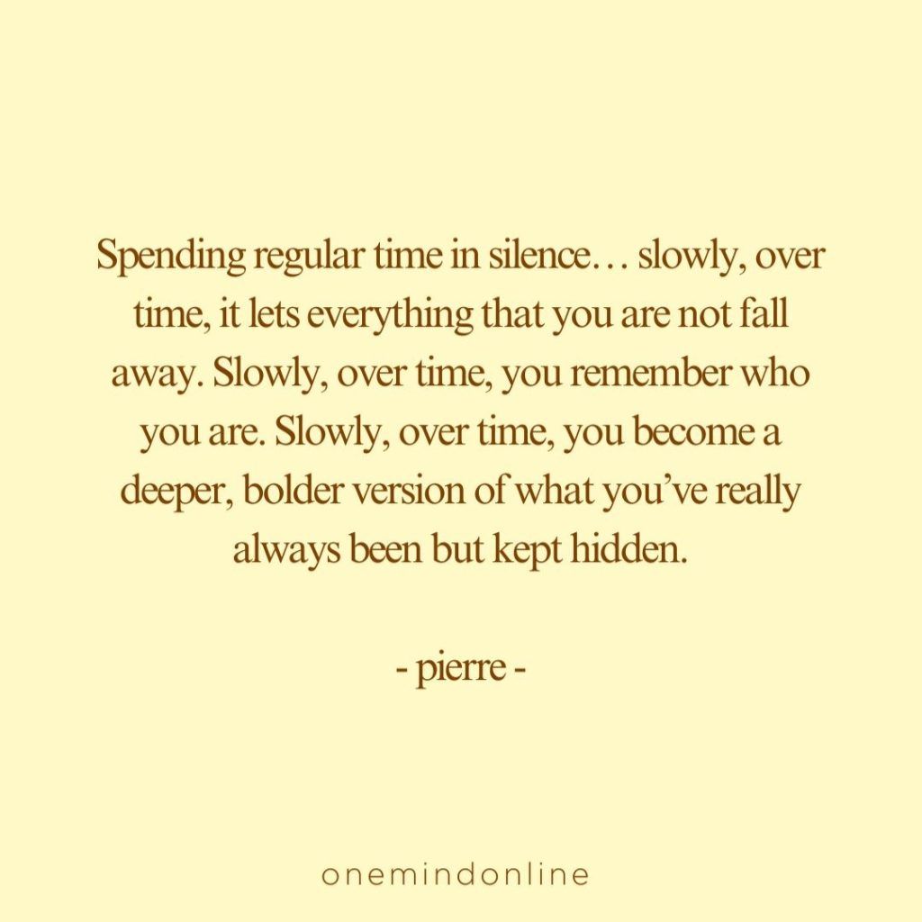 Spending regular time in silence… slowly, over time, it lets everything that you are not fall away. Slowly, over time, you remember who you are. Slowly, over time, you become a deeper, bolder version of what you’ve really always been but kept hidden. – pierre –