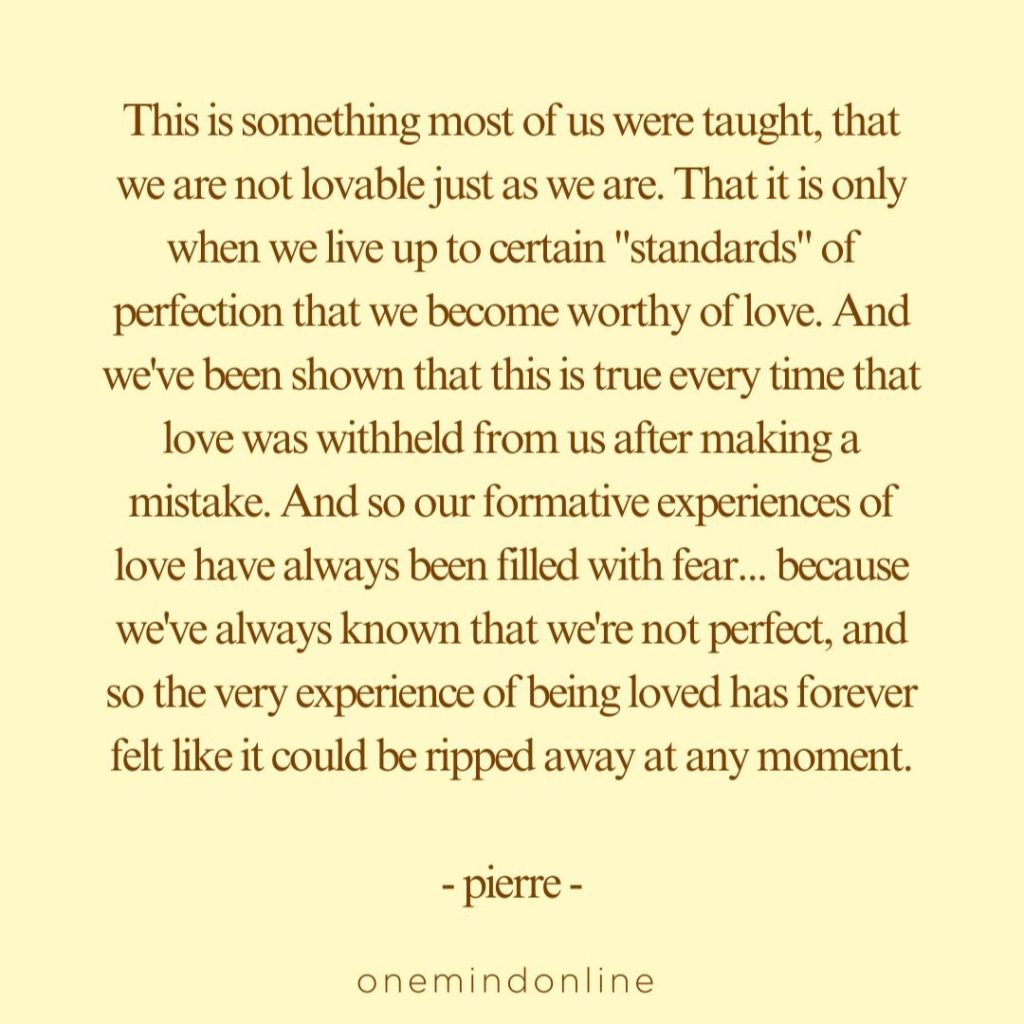 This is something most of us were taught, that we are not lovable just as we are. That it is only when we live up to certain “standards” of perfection that we become worthy of love. And we’ve been shown that this is true every time that love was withheld from us after making a mistake. And so our formative experiences of love have always been filled with fear… because we’ve always known that we’re not perfect, and so the very experience of being loved has forever felt like it could be ripped away at any moment. – pierre –