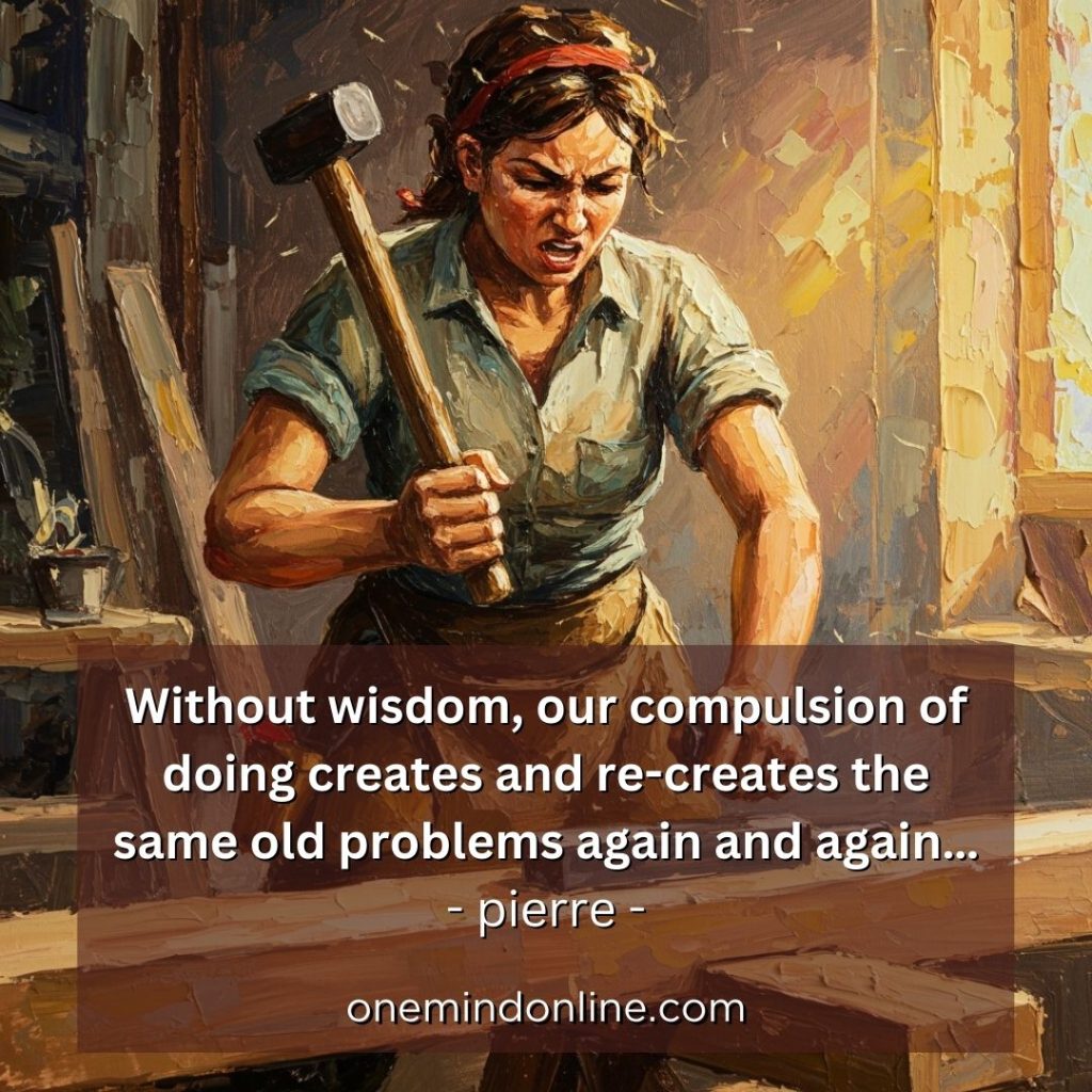 As a society we have worked ourselves into a corner of fear (scarcity), from where we are reactively “doing”. The compulsion to act without any deep understanding is what creates our hurrying, our greed and our manipulation. Without wisdom, our compulsion of doing creates and re-creates the same old problems again and again… – pierre –