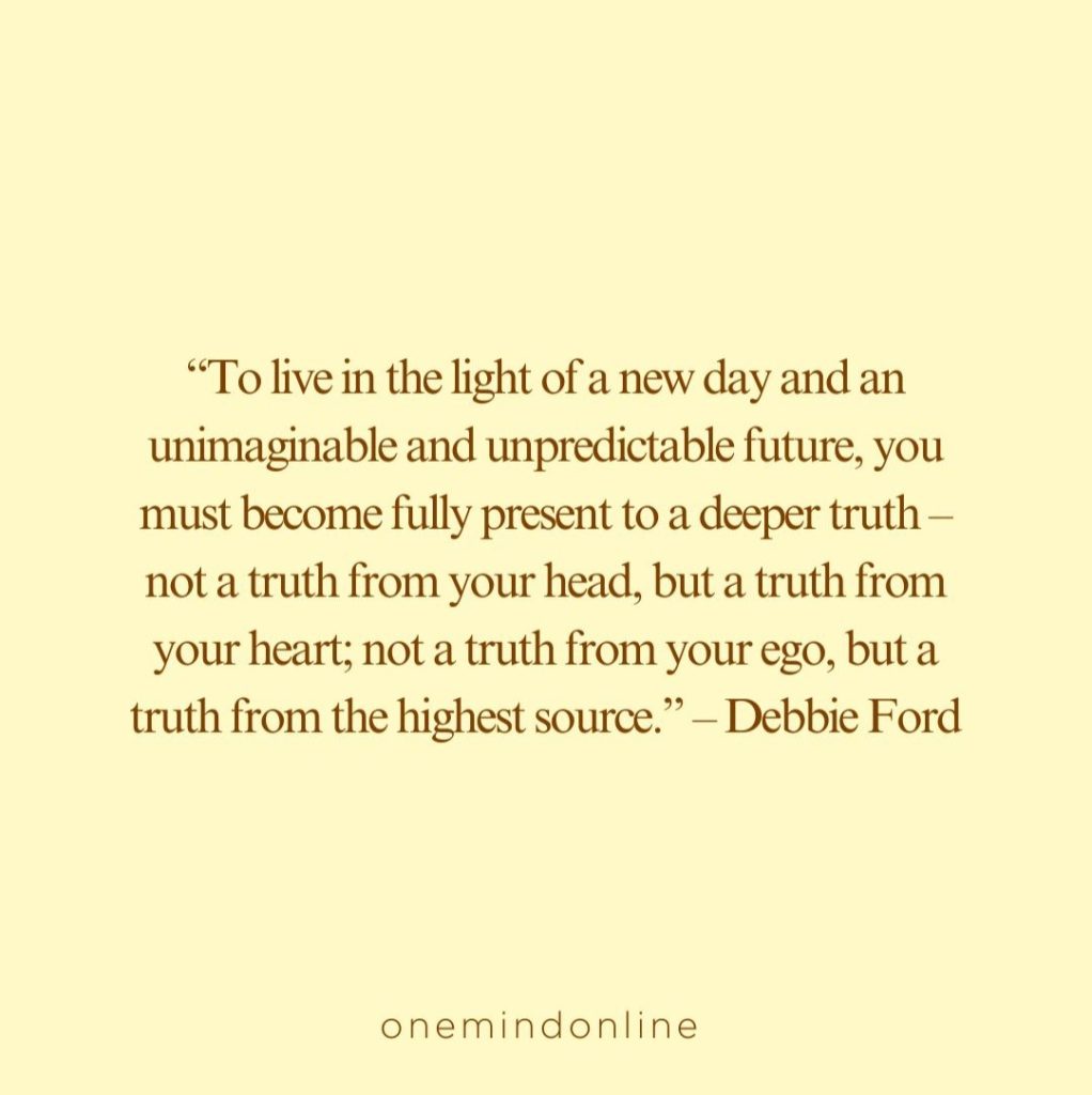 “To live in the light of a new day and an unimaginable and unpredictable future, you must become fully present to a deeper truth – not a truth from your head, but a truth from your heart; not a truth from your ego, but a truth from the highest source.” – Debbie Ford
