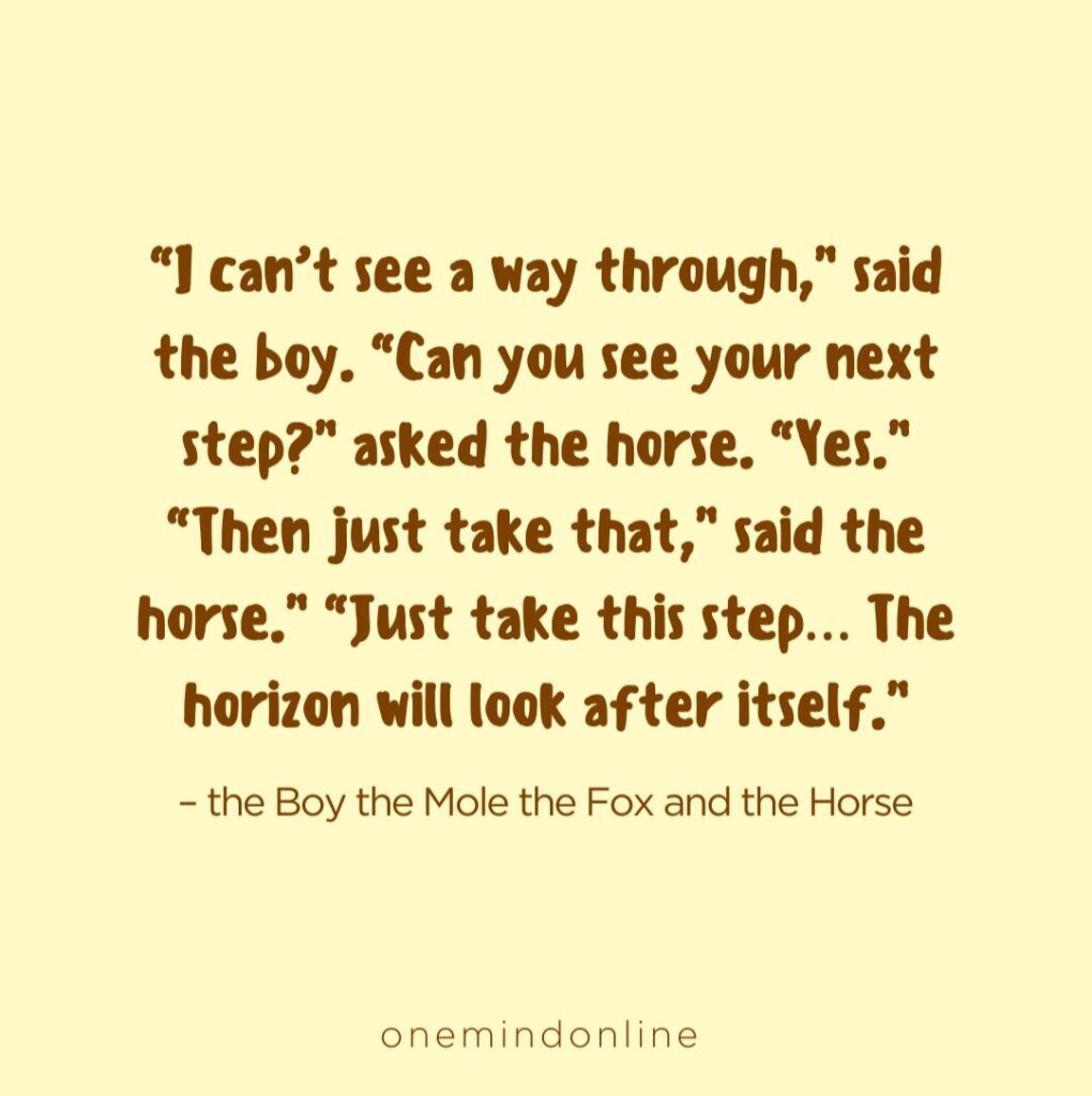 “I can’t see a way through,” said the boy. “Can you see your next step?” asked the horse. “Yes.” “Then just take that,” said the horse.” – the Boy the Mole the Fox and the Horse
