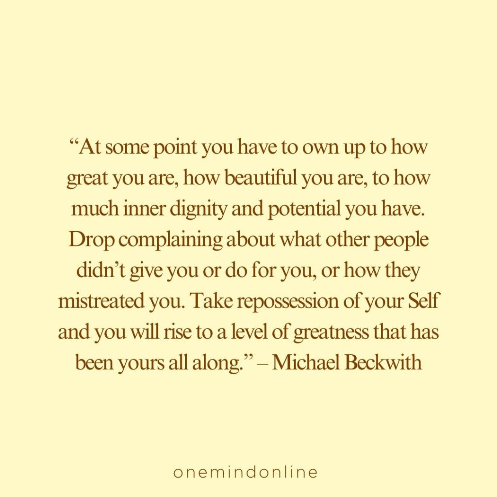 “At some point you have to own up to how great you are, how beautiful you are, to how much inner dignity and potential you have. Drop complaining about what other people didn’t give you or do for you, or how they mistreated you. Take repossession of your Self and you will rise to a level of greatness that has been yours all along.” – Michael Beckwith