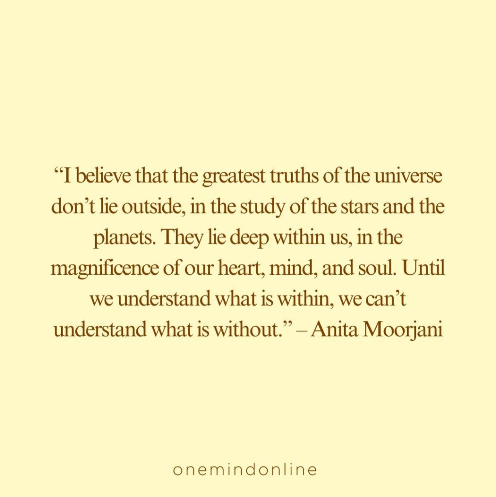 “I believe that the greatest truths of the universe don’t lie outside, in the study of the stars and the planets. They lie deep within us, in the magnificence of our heart, mind, and soul. Until we understand what is within, we can’t understand what is without.” – Anita Moorjani