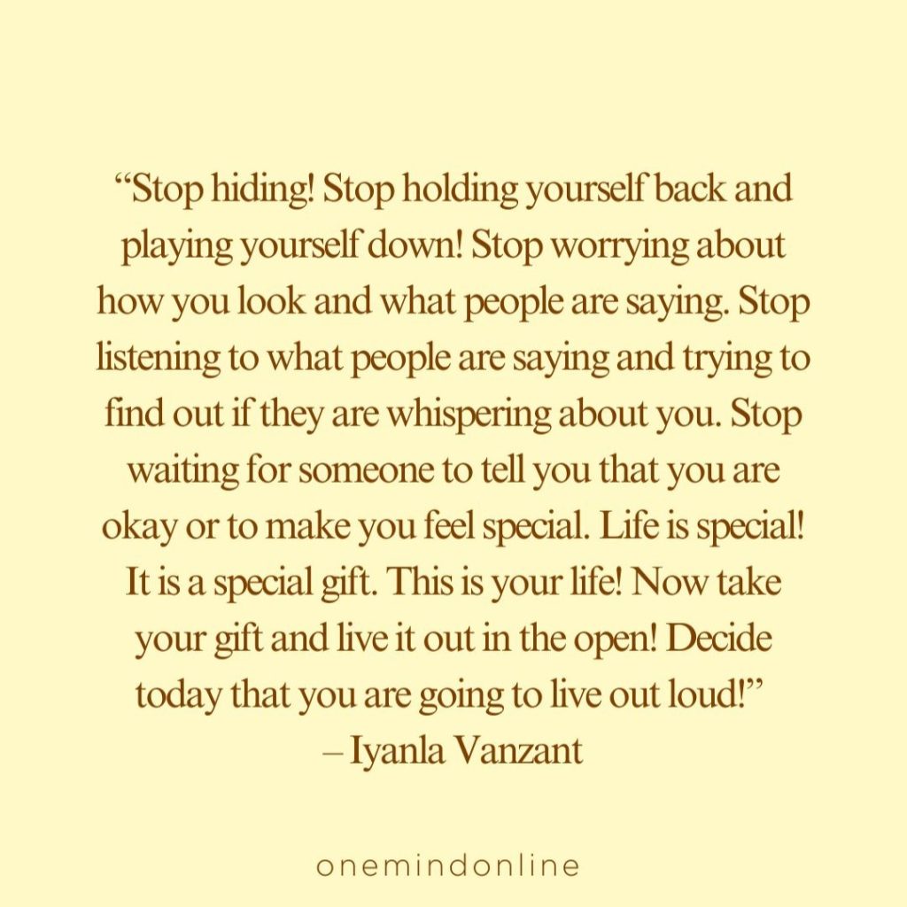 “Stop hiding! Stop holding yourself back and playing yourself down! Stop worrying about how you look and what people are saying. Stop listening to what people are saying and trying to find out if they are whispering about you. Stop waiting for someone to tell you that you are okay or to make you feel special. Life is special! It is a special gift. This is your life! Now take your gift and live it out in the open! Decide today that you are going to live out loud!” – Iyanla Vanzant