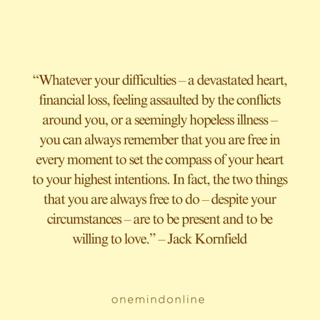 “Whatever your difficulties – a devastated heart, financial loss, feeling assaulted by the conflicts around you, or a seemingly hopeless illness – you can always remember that you are free in every moment to set the compass of your heart to your highest intentions. In fact, the two things that you are always free to do – despite your circumstances – are to be present and to be willing to love.” – Jack Kornfield