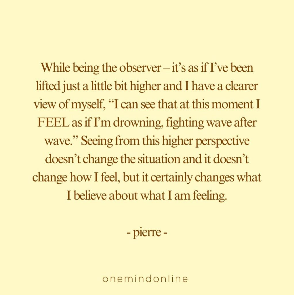 While being the observer – it’s as if I’ve been lifted just a little bit higher and I have a clearer view of myself, “I can see that at this moment I FEEL as if I’m drowning, fighting wave after wave.” Seeing from this higher perspective doesn’t change the situation and it doesn’t change how I feel, but it certainly changes what I believe about what I am feeling.