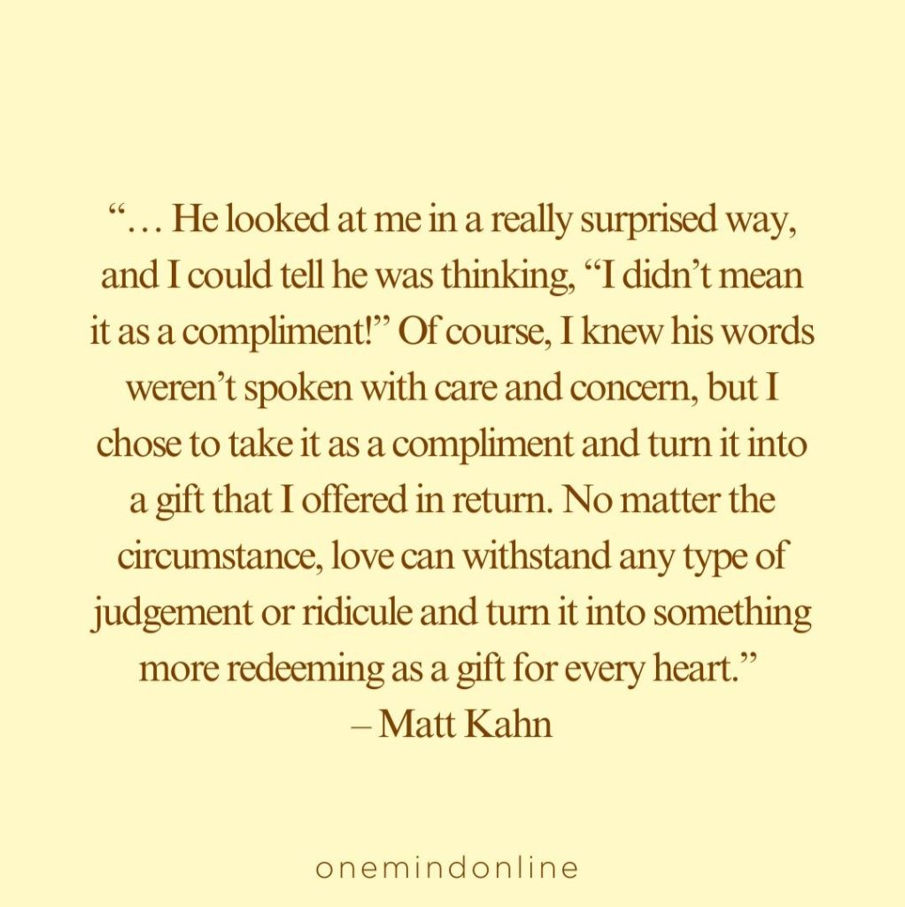 “… He looked at me in a really surprised way, and I could tell he was thinking, “I didn’t mean it as a compliment!” Of course, I knew his words weren’t spoken with care and concern, but I chose to take it as a compliment and turn it into a gift that I offered in return. No matter the circumstance, love can withstand any type of judgement or ridicule and turn it into something more redeeming as a gift for every heart.” – Matt Kahn