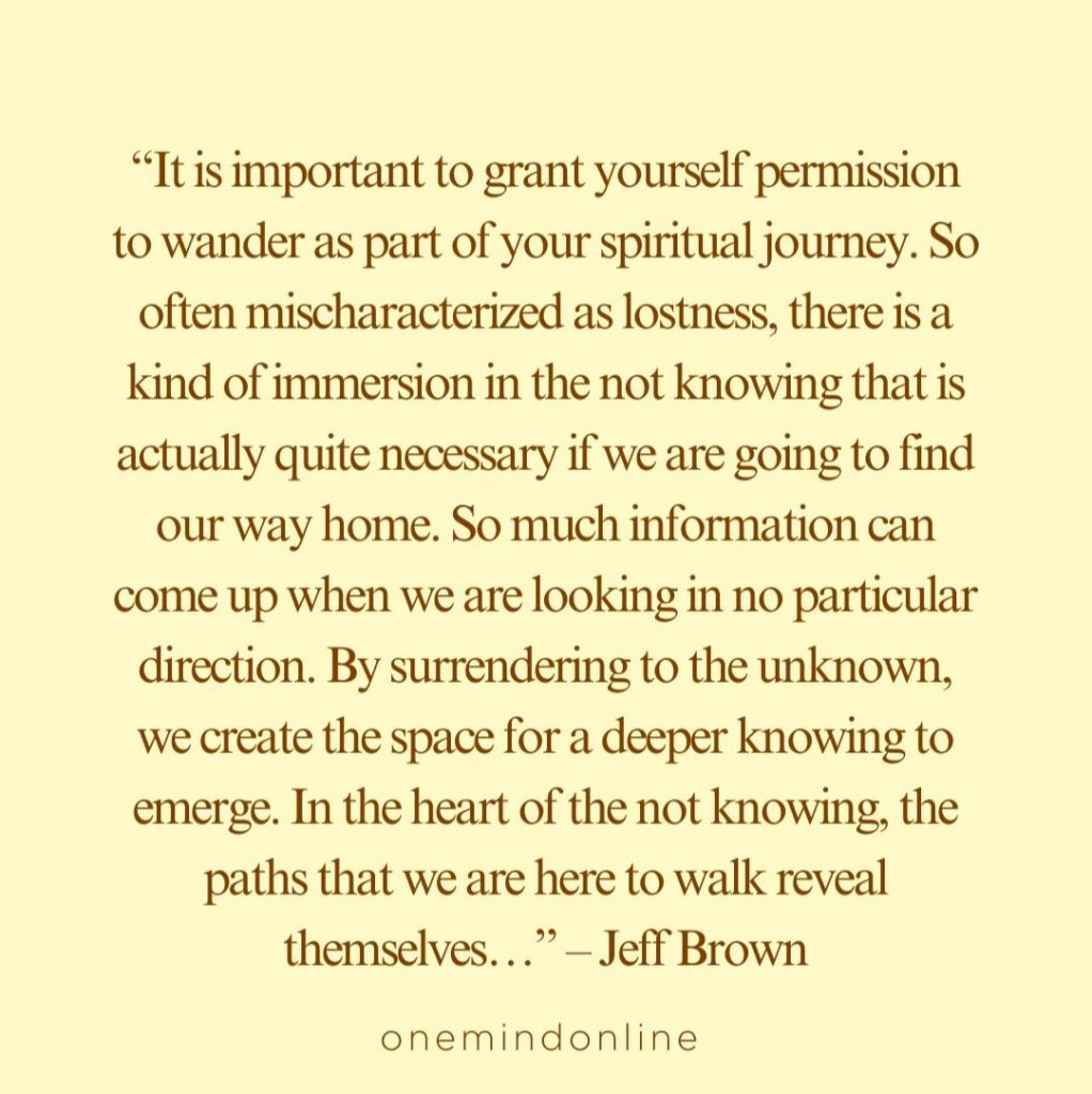 “It is important to grant yourself permission to wander as part of your spiritual journey. So often mischaracterized as lostness, there is a kind of immersion in the not knowing that is actually quite necessary if we are going to find our way home. So much information can come up when we are looking in no particular direction. By surrendering to the unknown, we create the space for a deeper knowing to emerge. In the heart of the not knowing, the paths that we are here to walk reveal themselves…” – Jeff Brown