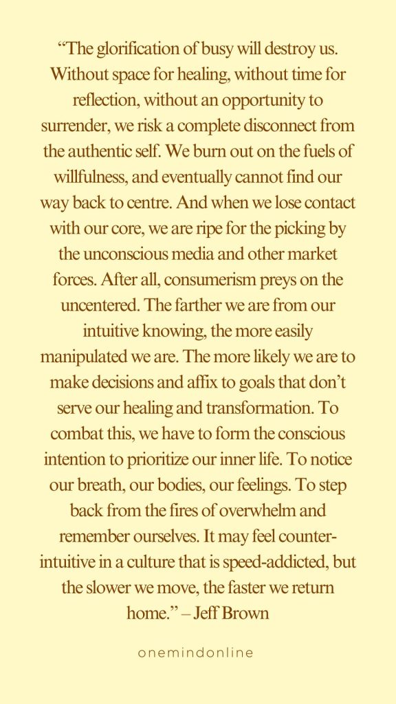 “The glorification of busy will destroy us. Without space for healing, without time for reflection, without an opportunity to surrender, we risk a complete disconnect from the authentic self. We burn out on the fuels of willfulness, and eventually cannot find our way back to centre. And when we lose contact with our core, we are ripe for the picking by the unconscious media and other market forces. After all, consumerism preys on the uncentered. The farther we are from our intuitive knowing, the more easily manipulated we are. The more likely we are to make decisions and affix to goals that don’t serve our healing and transformation. To combat this, we have to form the conscious intention to prioritize our inner life. To notice our breath, our bodies, our feelings. To step back from the fires of overwhelm and remember ourselves. It may feel counter-intuitive in a culture that is speed-addicted, but the slower we move, the faster we return home.” – Jeff Brown