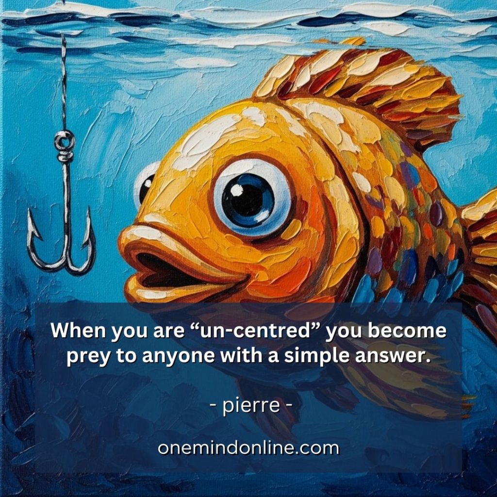 When you are “un-centred” you become prey to anyone with a simple answer whether it’s “here, buy this bling” or “here, go on this holiday” or “here, drink this brand of alcohol”… the products themselves are not “bad” but they are being marketed to our woundedness, our insecurities, which makes us easy targets when we feel overwhelmed. The only way to avoid these traps is to “step back from the fires of overwhelm” and find your centre again.
