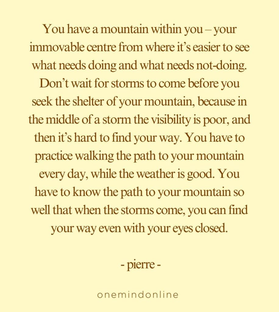 You have a mountain within you – your immovable centre from where it’s easier to see what needs doing and what needs not-doing. You have to practice walking the path to this mountain because it’s not always immediately obvious. Practice every day, don’t wait for the storm to come before you seek refuge in your mountain. If you don’t become really good at finding the path on the beautiful sunny days, it will be very hard to find when the storms come.