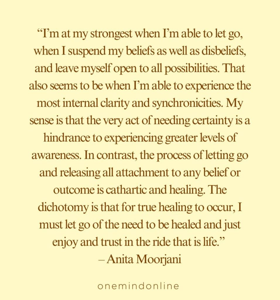 “I’m at my strongest when I’m able to let go, when I suspend my beliefs as well as disbeliefs, and leave myself open to all possibilities. That also seems to be when I’m able to experience the most internal clarity and synchronicities. My sense is that the very act of needing certainty is a hindrance to experiencing greater levels of awareness. In contrast, the process of letting go and releasing all attachment to any belief or outcome is cathartic and healing. The dichotomy is that for true healing to occur, I must let go of the need to be healed and just enjoy and trust in the ride that is life.” – Anita Moorjani