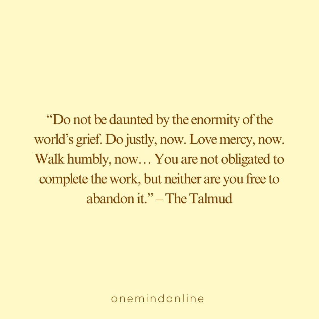 “Do not be daunted by the enormity of the world’s grief. Do justly, now. Love mercy, now. Walk humbly, now… You are not obligated to complete the work, but neither are you free to abandon it.” – The Talmud
