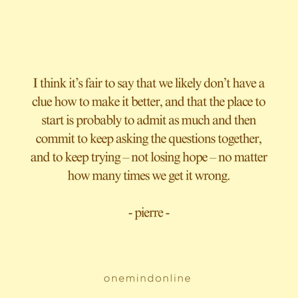 I think it’s fair to say that we likely don’t have a clue how to make it better, and that the place to start is probably to admit as much and then commit to keep asking the questions together, and to keep trying – not losing hope – no matter how many times we get it wrong.