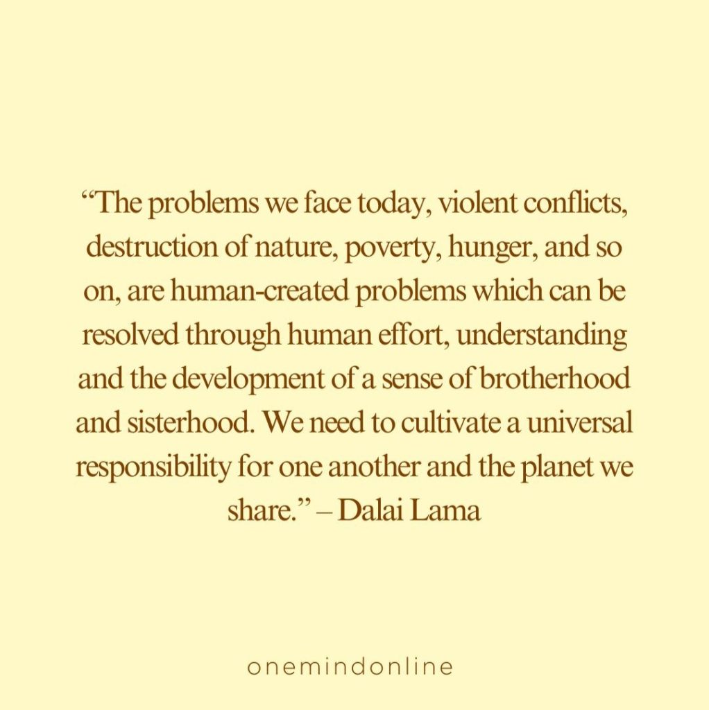 “The problems we face today, violent conflicts, destruction of nature, poverty, hunger, and so on, are human-created problems which can be resolved through human effort, understanding and the development of a sense of brotherhood and sisterhood. We need to cultivate a universal responsibility for one another and the planet we share.” – Dalai Lama