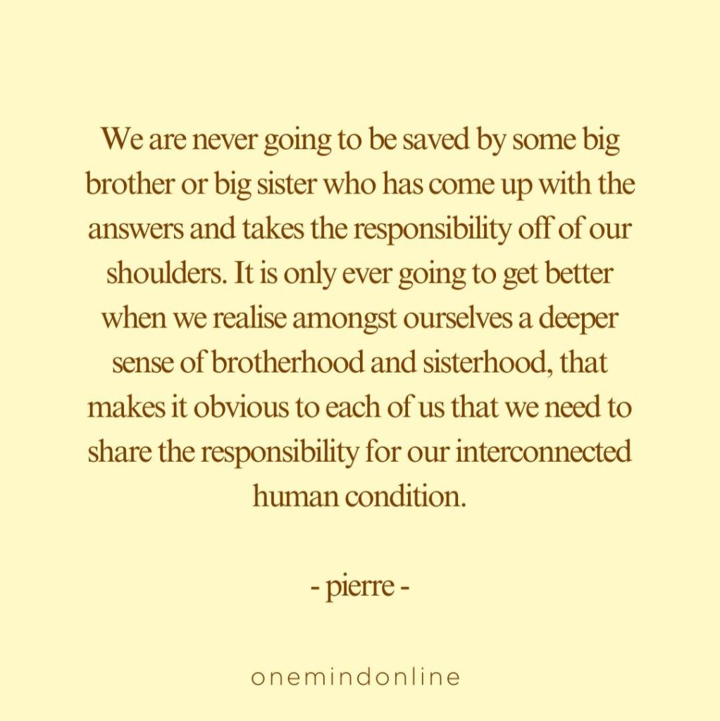 We are never going to be saved by some big brother or big sister who has come up with the answers and takes the responsibility off of our shoulders. It is only ever going to get better when we realise amongst ourselves a deeper sense of brotherhood and sisterhood, that makes it obvious to each of us that we need to share the responsibility for our interconnected human condition.