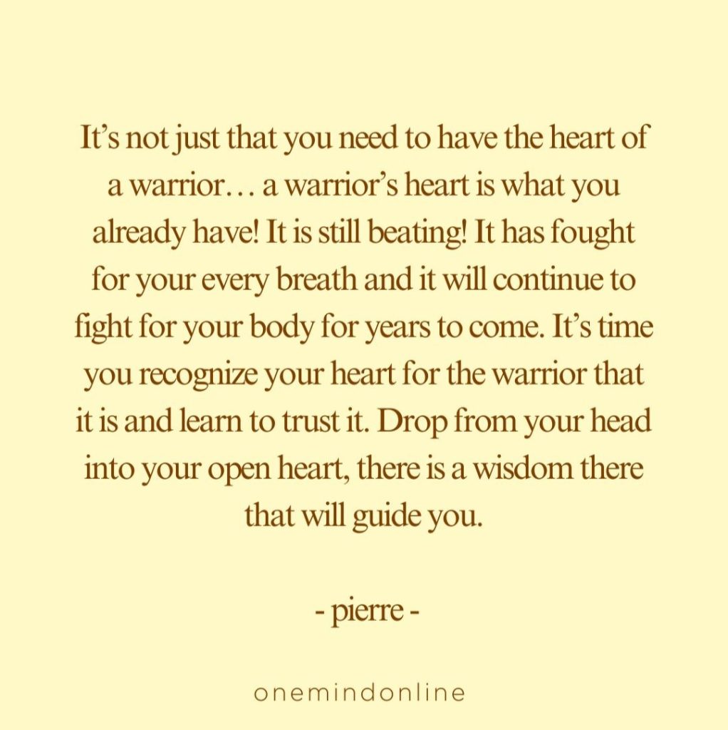 It’s not just that you need to have the heart of a warrior… a warrior’s heart is what you already have! It is still beating! It has fought for your every breath and it will continue to fight for your body for years to come. It’s time you recognize your heart for the warrior that it is and learn to trust it. Drop from your head into your open heart, there is a wisdom there that will guide you.
