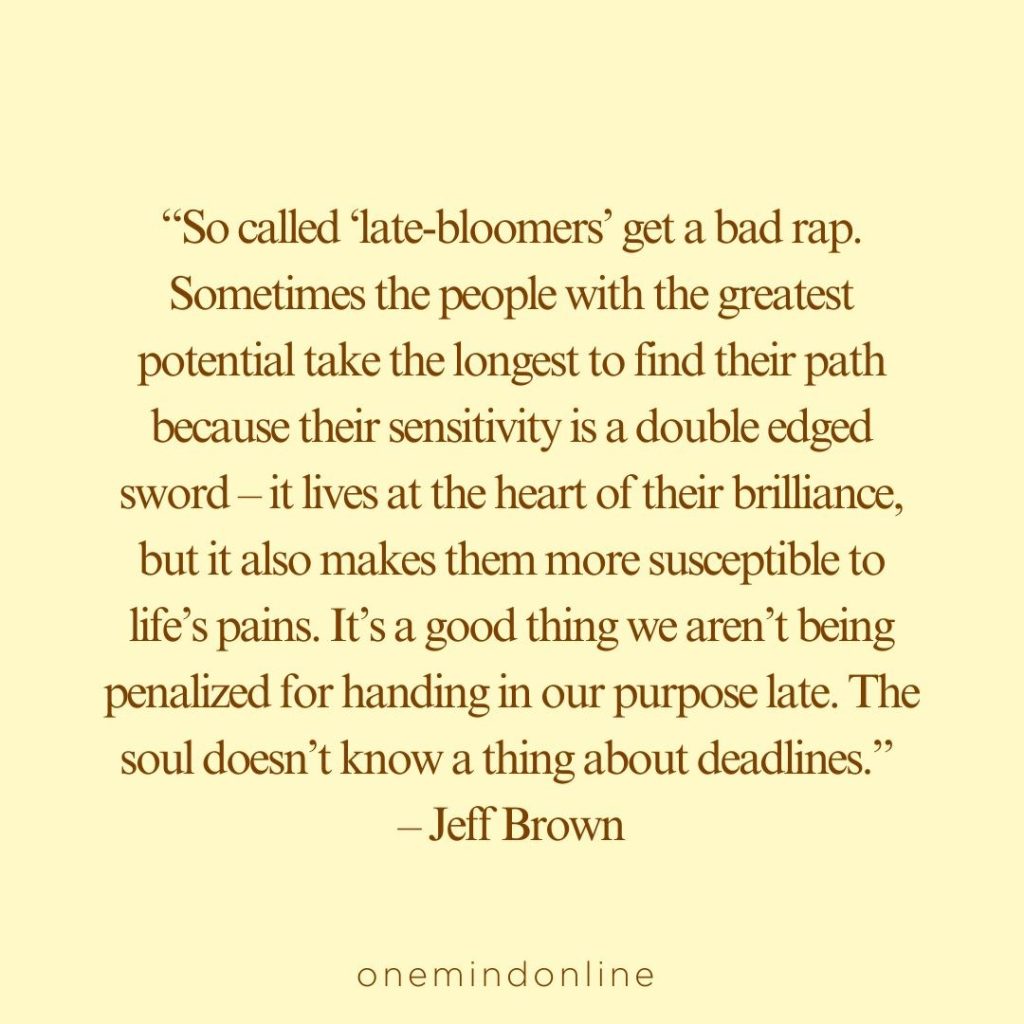 “So called ‘late-bloomers’ get a bad rap. Sometimes the people with the greatest potential take the longest to find their path because their sensitivity is a double edged sword – it lives at the heart of their brilliance, but it also makes them more susceptible to life’s pains. It’s a good thing we aren’t being penalized for handing in our purpose late. The soul doesn’t know a thing about deadlines.” – Jeff Brown