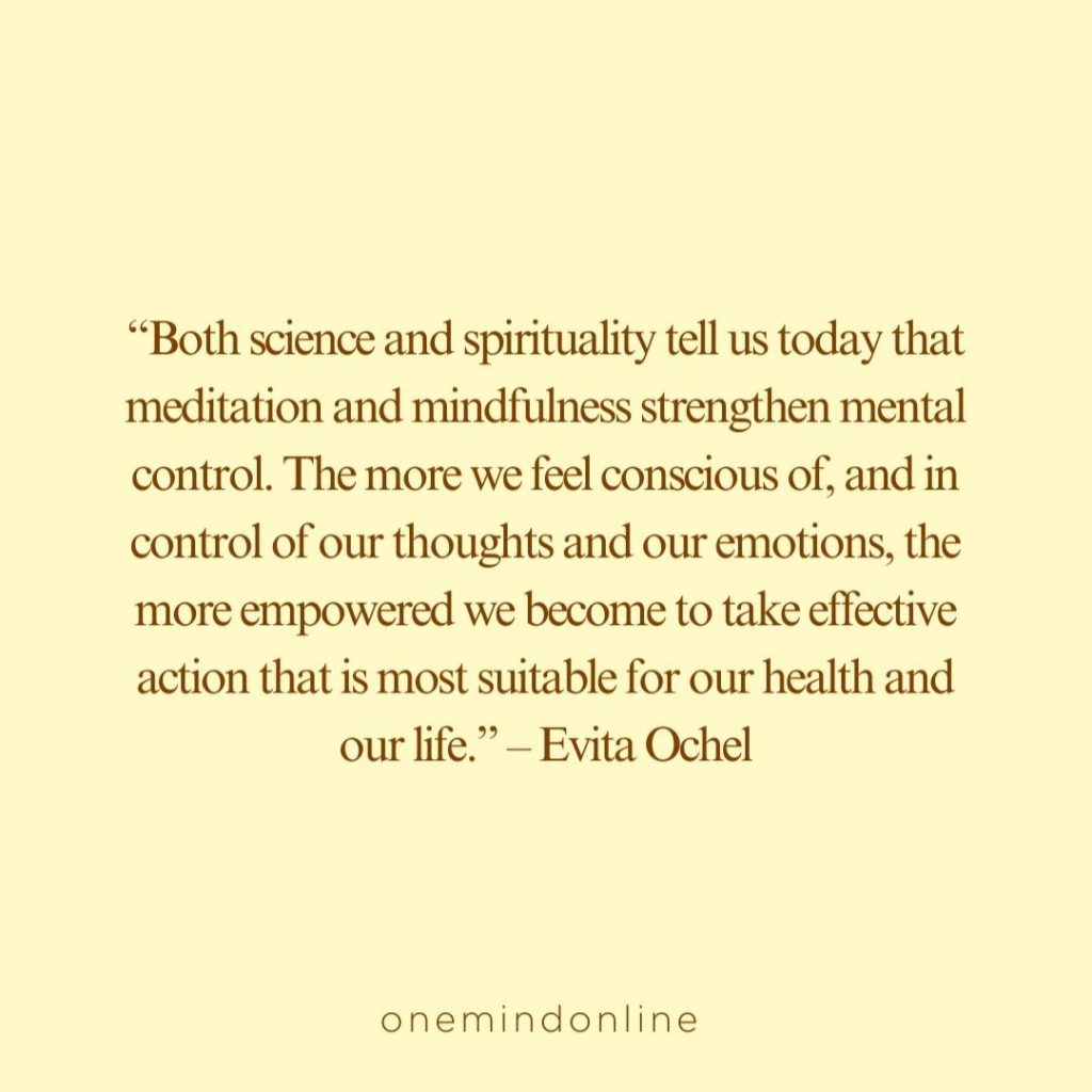 “Both science and spirituality tell us today that meditation and mindfulness strengthen mental control. The more we feel conscious of, and in control of our thoughts and our emotions, the more empowered we become to take effective action that is most suitable for our health and our life.” – Evita Ochel